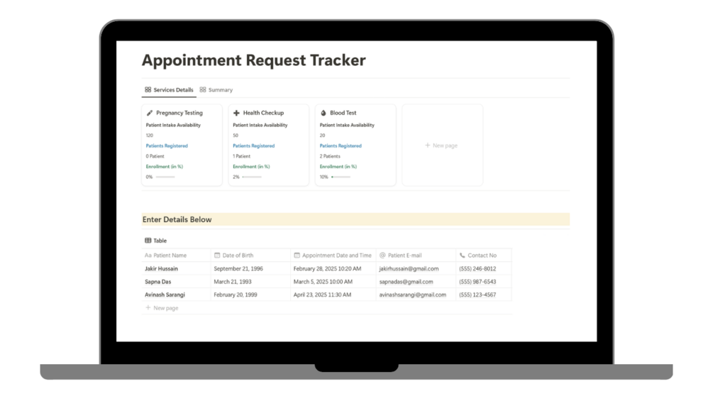 In this template, businesses can keep track of their appointment requests with ease with the use of this simple Notion Template.
