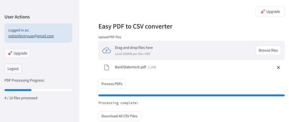Simply upload your PDF Files and get the converted CSV Files in under a minute.