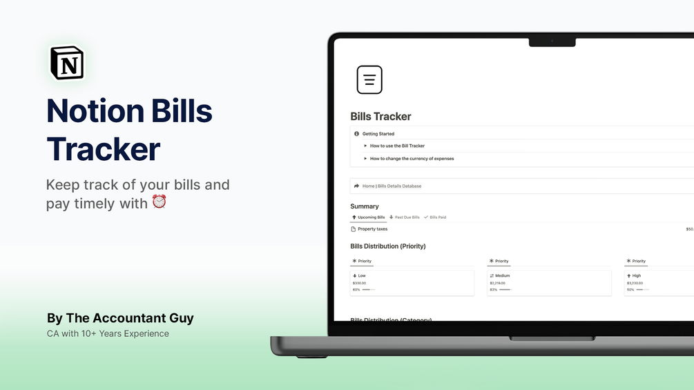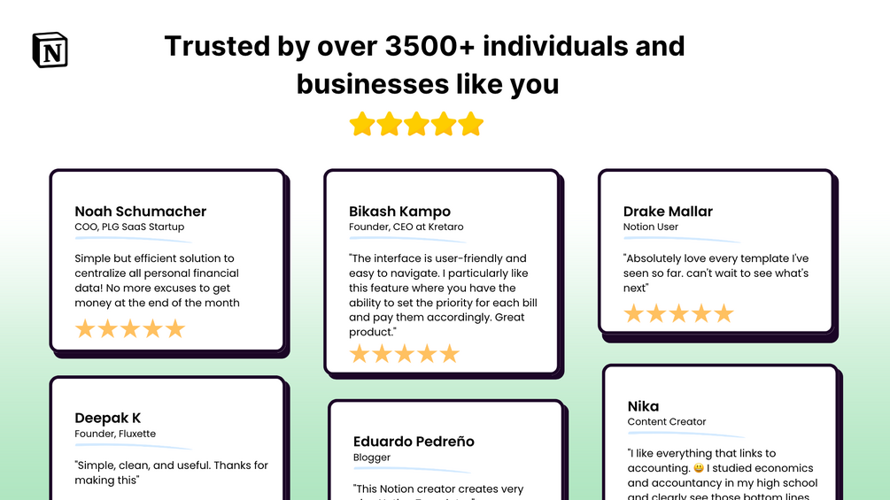 Note: The Notion Ultimate Finance Bundle are a set of individual templates which are used to track for personal finances with their respective use and not interpreted otherwise.
