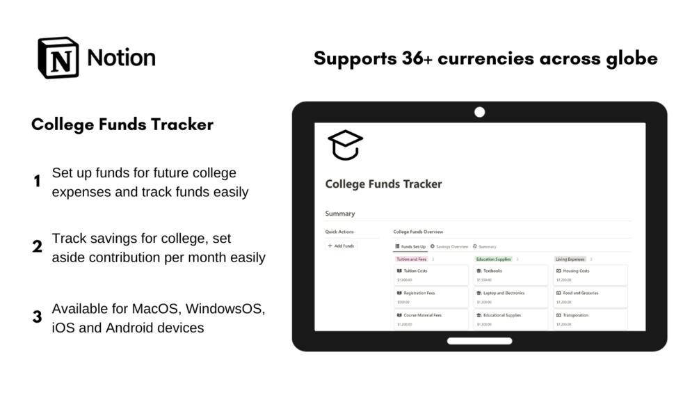 College Funds Tracker hasn't provided you with any value? Email notionformyuse@gmail.com; we'll give you a refund within the first 30 days of purchase (for valid reasons).