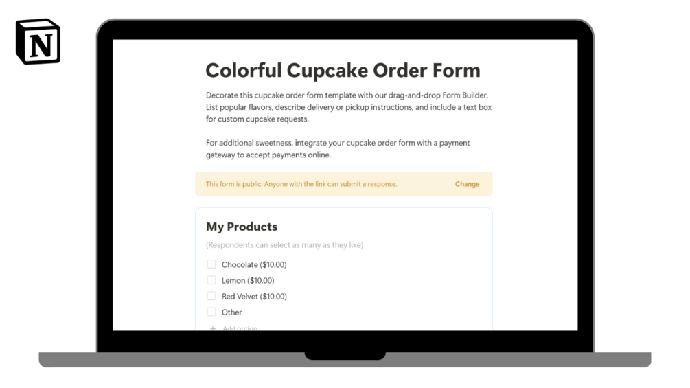 In this template, businesses can keep track of their Colorful Cupcake requirements with ease with the use of this simple Notion Form Template.