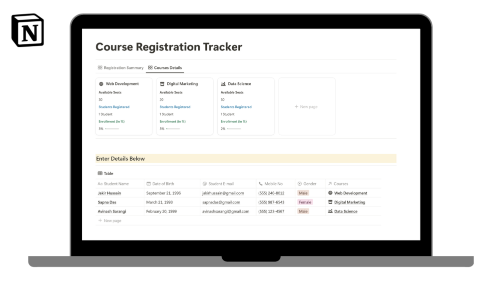 In this template, businesses can keep track of their course registrations with ease with the use of this simple Notion Template.