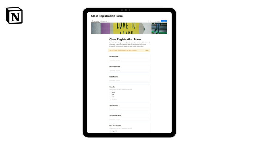 In this template, businesses can keep track of their Class Registrations with ease with the use of this simple Notion Form Template.