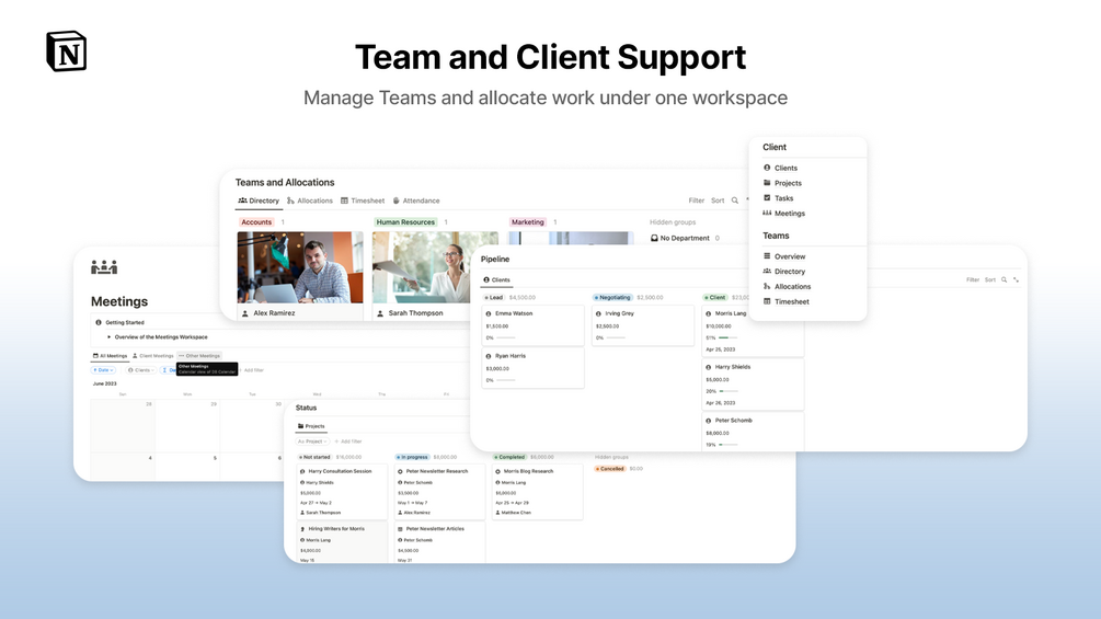 - Clients and Teams portal: It provides a one-glance view of a dashboard that comprises the clients' and teams' details working in the organization.