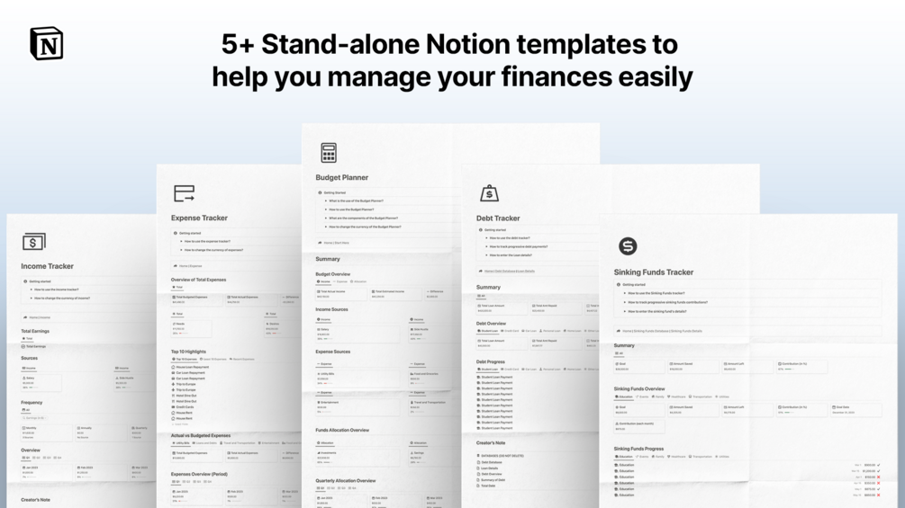 Note: The Notion Ultimate Finance Bundle are a set of individual templates which are used to track for personal finances with their respective use and not interpreted otherwise.
