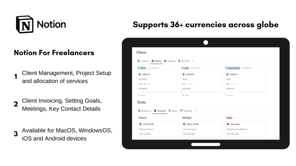 This Notion template is all you need to manage all your finances, client management, invoicing, setting goals and meetings and much more in one place with a simple and easy to use interface as shown below.