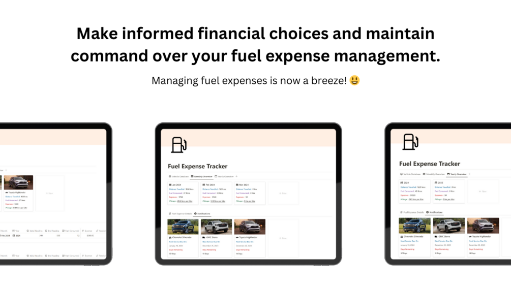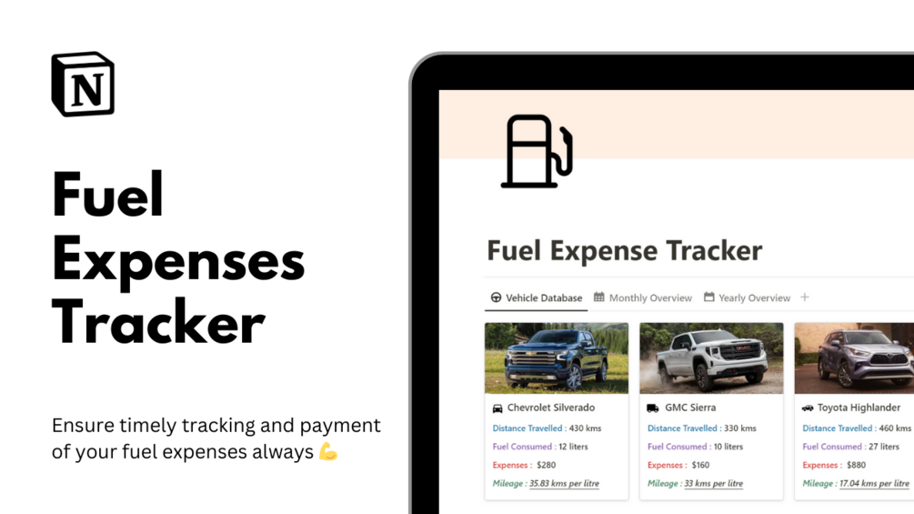 The Fuel Expense Tracker in Notion provides a simple solution for efficiently managing your fuel expenditures.