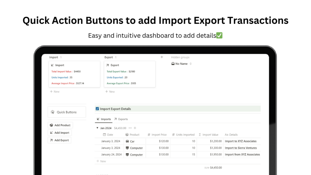 This tracker is perfect to quickly add products for import and export, and keep complete overview of the total import and export of the different products under one dashboard.