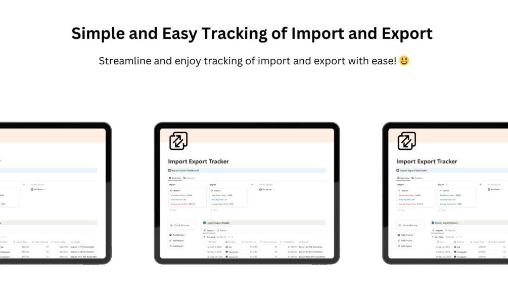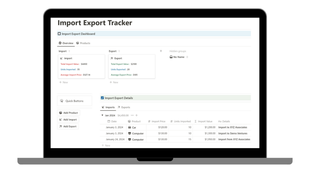 This tracker is perfect to quickly add products for import and export, and keep complete overview of the total import and export of the different products under one dashboard.