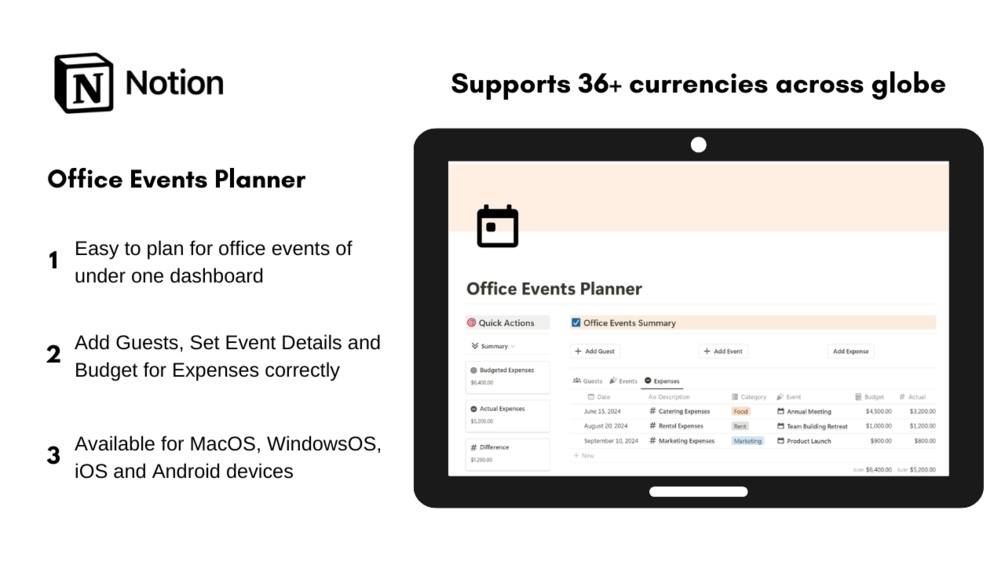 - Set up comprehensive management of office events, including adding guest lists, setting events details and budgeting of expenses and much more.