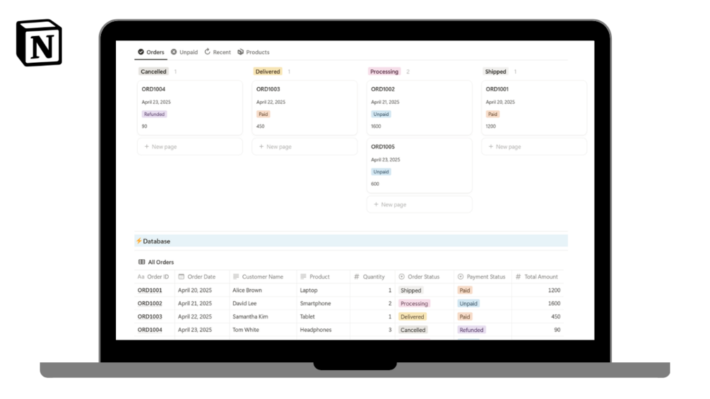 In this template, businesses can keep track of their Orders received from users with ease with the use of this simple Notion Template.