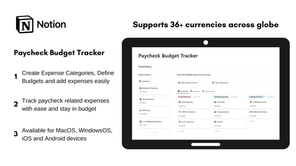 - Add your own categories of paycheck related expenses such as Fixed Expenses, Variable Expenses or Savings / Investments etc as per your requirement to track each paycheck related expenses.