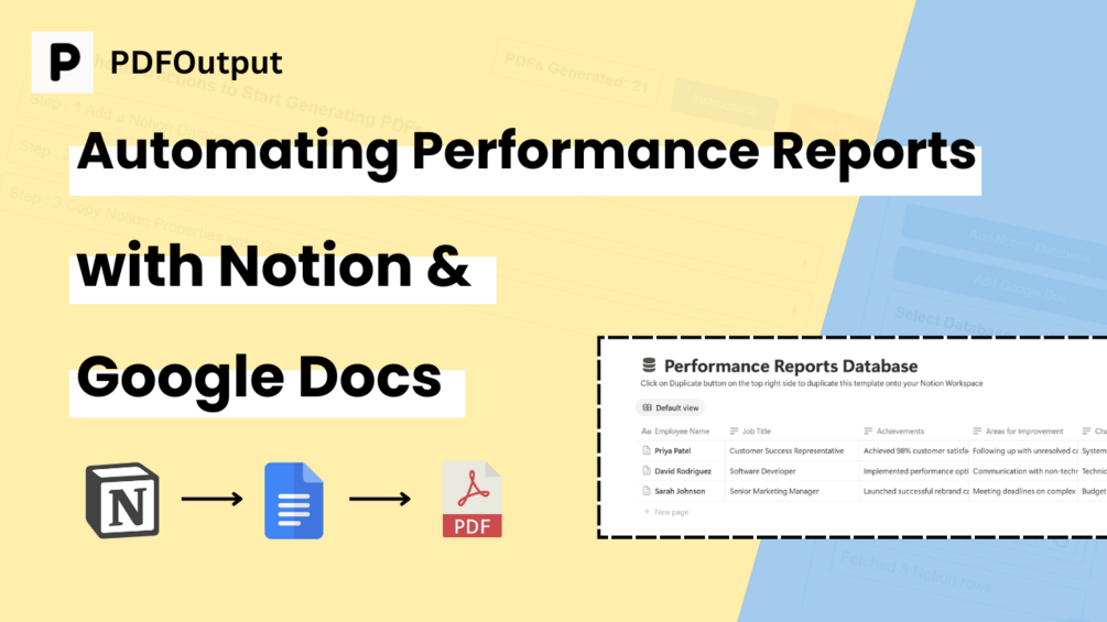 Generate Performance Reports PDFs on automation from a Notion database using Google Doc as a template.