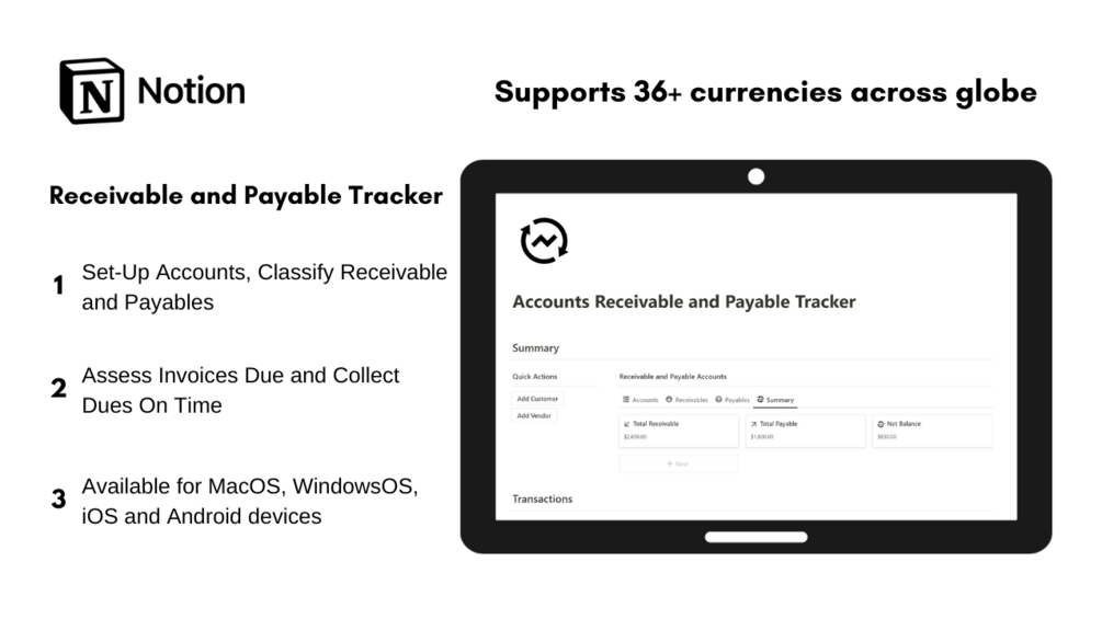 This Notion template is all you need to manage all your customer and vendor balances with a simple and easy to use interface setting accounts, opening balances, entering transactions and much more.