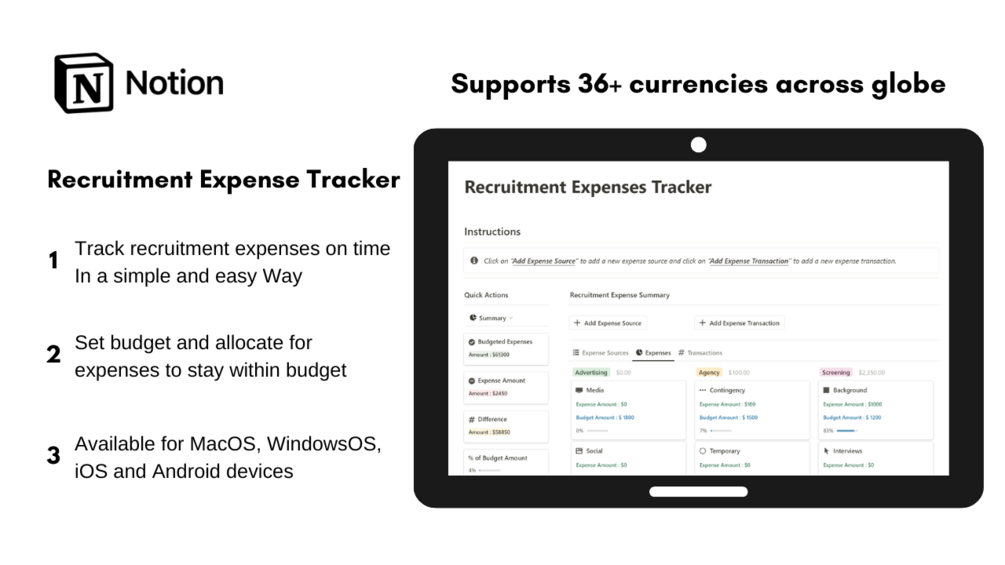 Recruitment Expense Tracker hasn't provided you with any value? Email notionformyuse@gmail.com; we'll give you a refund within the first 30 days of purchase (for valid reasons).