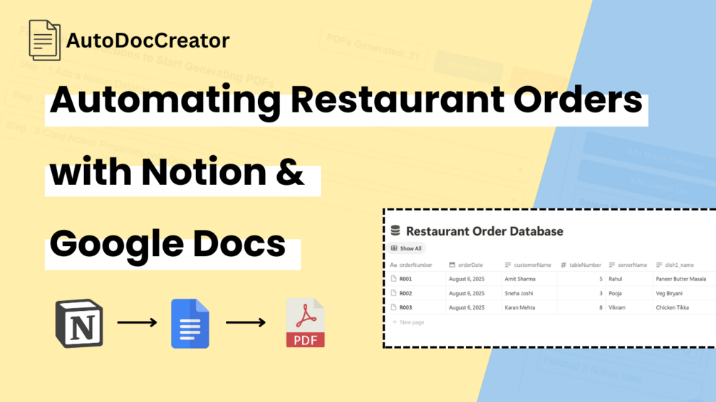 Generate Restaurant Order PDFs on automation from a Notion database using Google Doc as a template.
