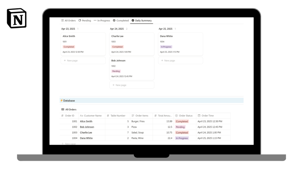 In this template, businesses can keep track of their Restaurant Orders received from users with ease with the use of this simple Notion Template.