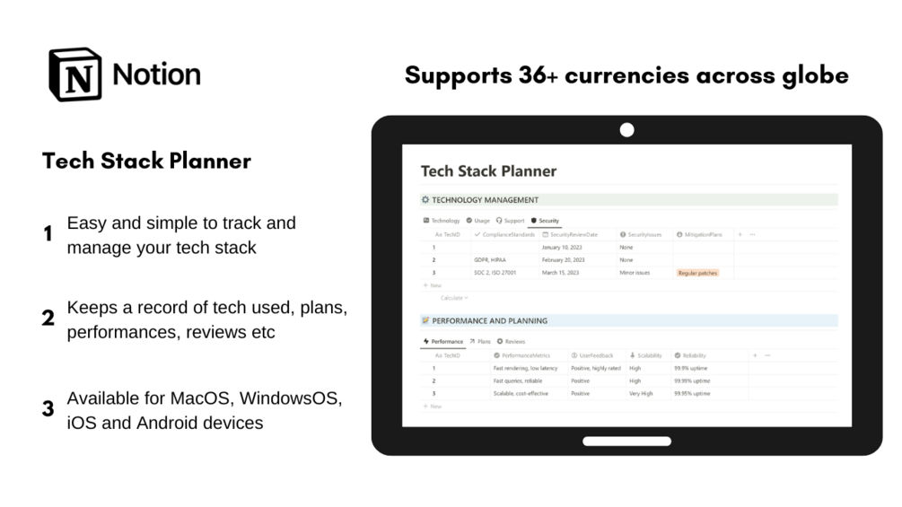 This tracker is perfect to add tech stack basic details, add usage, seek for support, add security, check performance, set future plans and check for tech reviews as well.