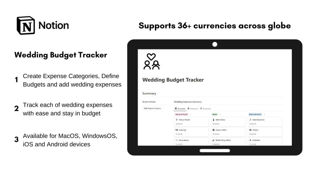 For couples planning a wedding, this tracker helps manage the costs associated with the big day, including venue, catering, attire, and more.